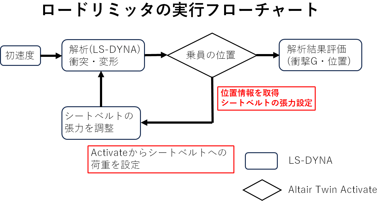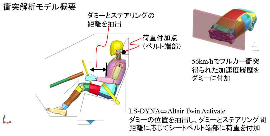LS-DYNAを使用した簡易衝突モデルとAltair Twin Activateを用い、荷重制御するとともにLS-DYNAのセンサ機能を組み合わせることでロードリミッタをモデル化し、シートベルトの制御および効果を確認する事例を紹介します。