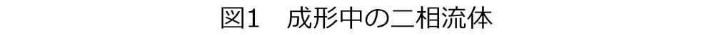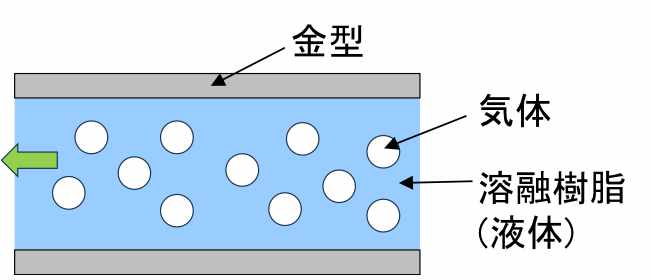 樹脂成形品は断熱性、遮音性の確保や軽量化のために気泡を含むタイプのものが存在します。発泡のさせ方は樹脂にブレンドした発泡剤を減圧、加熱、化学反応などにより気化させる方法を用います。成形中は図1のように溶融樹脂と気体の二相流となって金型内を流動します。この流れは、機械工学便覧の定義によると「気体と液体が混ざった混相流で、両者の流量の割合で種々の流れのパターンが観察される。固液二相流や固気二相流に比べての特徴は気相と液相の界面が変化することである。さらに粒子状態となった気泡や液滴が分裂と合体を繰り返すため、微視的観点に立つと現象は極めて複雑である。」と記載されています。このため、特にプラント設計の分野では気体と液体の接触の仕方で分類し、それぞれで圧力損失の予測式を立てる方式を用いています。このように厳密にはかなり複雑な現象ですが、見かけ粘度を簡便に見積もる方法も提案されており、ここではその中で使いやすい「体積流量率粘度」について説明します。