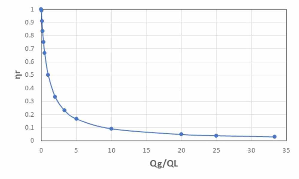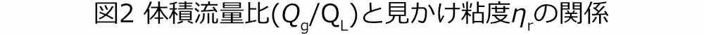 Qg / QLと\(\eta\)rの関係を図2に示します。気体側の体積流量比率が増えるにしたがって比粘度\(\eta\)rは低下していきます。気体とその周りの液体が同速度で同方向に移動する場合、体積流量比率は体積比率とみなすことができます。図2の関係を用いて気液二相流が流動中の圧力損失などの予測に役立てることができます。